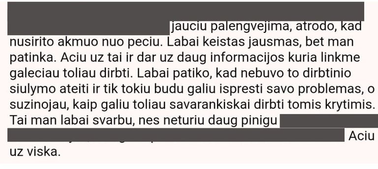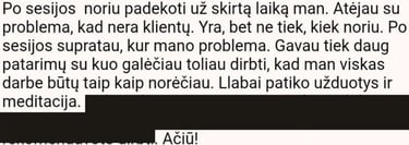 Dėmesio! Su depresija, stipriais nerimo sutrikimais, savęs žalojimo mintimis ar kitomis sudėtingomis būsenomis aš nedirbu. Kuo skubiau kreipkitės į gydytoją, psichikos sveikatos specialistą ar pagalbos linijas.