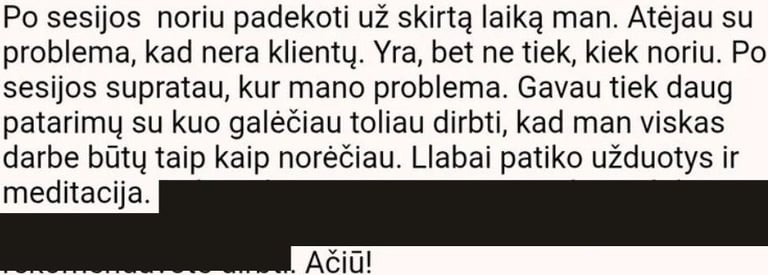 Sesijos metu padedu rasti ir keisti gilumines problemų priežastis. Dažniausiai dirbu su pasąmoniniais įsitikinimais, baimėmis, saviverte ir pasitikėjimu savimi. Tai yra tai, kas dažniausiai trukdo pasiekti savo tikslus.